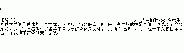 2017年某市将有5万名学生参加中考,为了解这些考生的数学成绩,中考后将从中抽取2000名考生的数学成绩进行统计分析,在这个问题中,下列说法正确的是( )