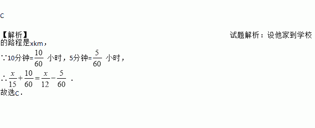 小明从家里骑车到学校,每小时骑15km,可早到10分钟,每小时骑12 km,就会迟到5分钟.问他家到学校的路程是多少千米?设他家到学校的路程为x千米,则根据题意列出方程正确的是
