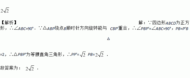 如图所示,P是正方形ABCD内一点,将△ABP绕点B顺时针方向旋转能与△CBP′重合,若PB=2,则PP′=_______.