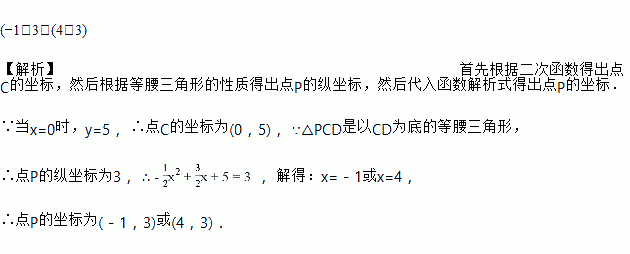 与轴交于点C,点D(0,1),点P是抛物线上的动点.若△PCD是以CD为底的等腰三角形,则点P的坐标为________.![]()