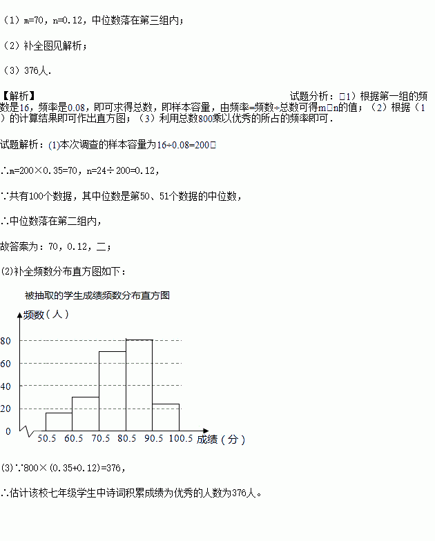 £¨3£©Èô¹æ¶¨³É¼¨³¬¹ý80·ÖΪÓÅÐ㣬Çë¹À¼Æ¸ÃУÆßÄ꼶ѧÉúÖÐÊ«´Ê»ýÀ۳ɼ¨ÎªÓÅÐãµÄÈËÊý.