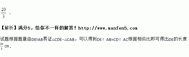 如图,测量小玻璃管口径的量具ABC,AB的长为10cm,AC被分为60等份.如果小玻璃管口DE正好对着量具上20等份处(DE∥AB),那么小玻璃管口径DE是 cm.