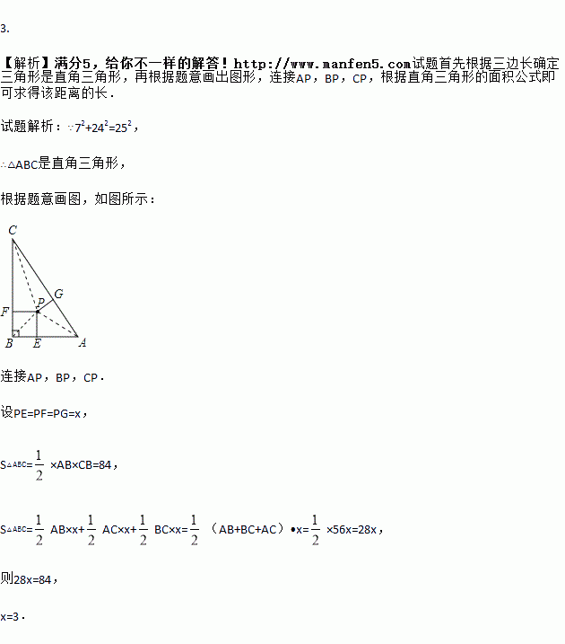 边长为7,24,25的△ABC内有一点P到三边距离相等,则这个距离为__.