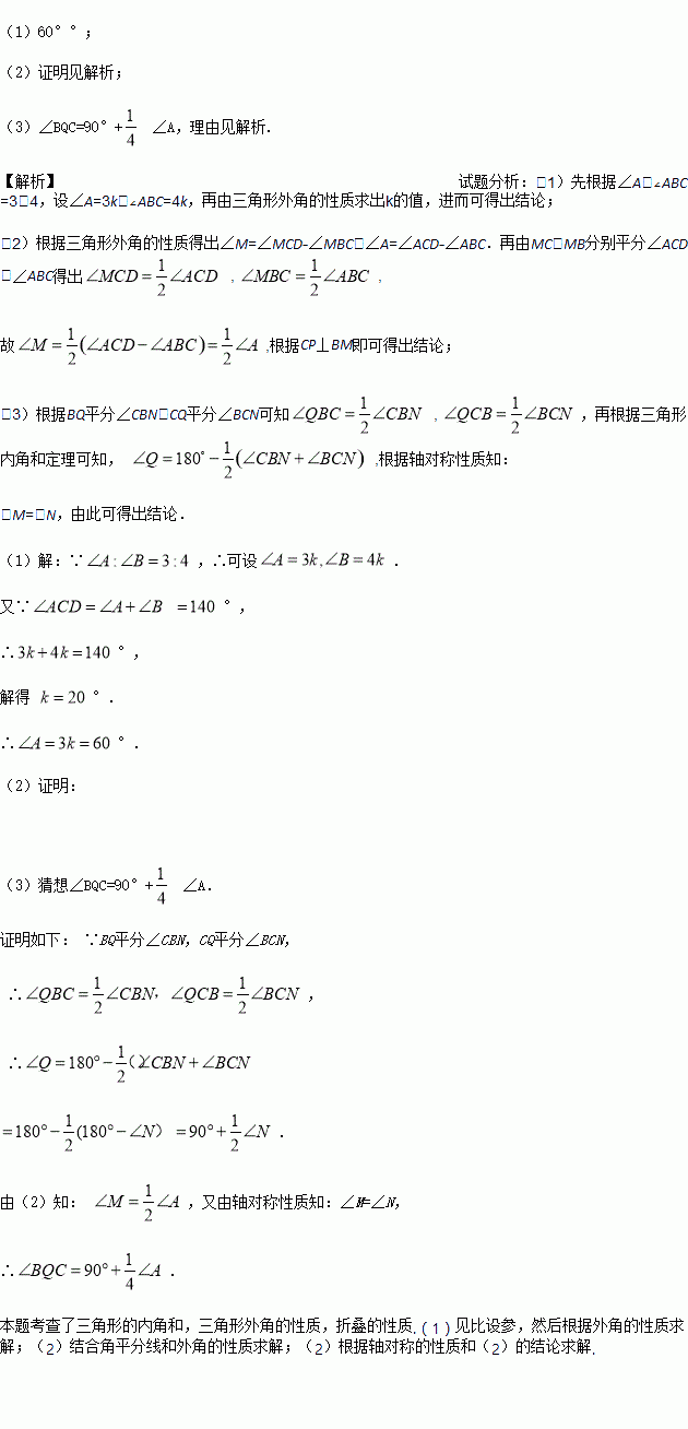 (1)若∠A∶∠ABC=3∶4,∠ACD=140°,求∠A的度数;