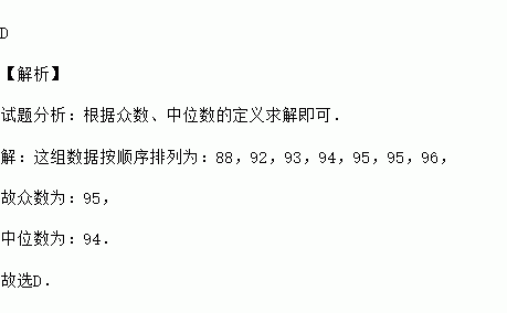 在一次歌咏比赛中,某选手的得分情况如下:92,88,95,93,96,95,94.这组数据的众数和中位数分别是( )