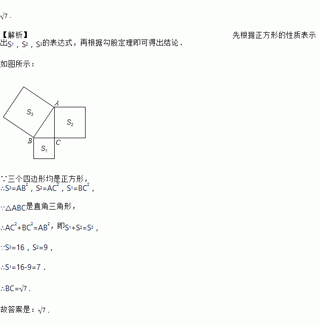 在△ABC 中,C=90o,分别以AB、AC为边向外作正方形,面积分别记为S1、S2.若 S1=16,S2=9,则BC=______.