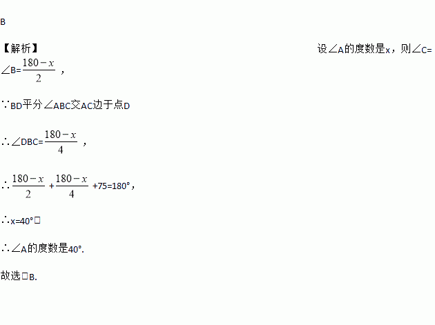 △ABC中,AB =AC,BD平分∠ABC交AC边于点D,∠BDC=75。,则∠A的度数是( )