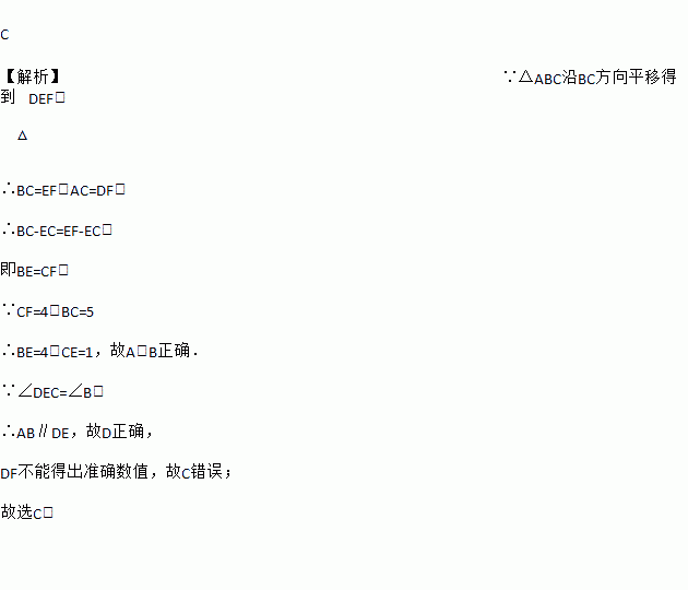 如图,把三角形ABC沿BC的方向平移到三角形DEF的位置,若CF=4,BC=5,则下列结论中错误的是( )