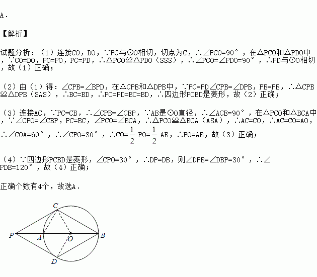 (1)PD与⊙O相切;(2)四边形PCBD是菱形;(3)PO=AB;(4)∠PDB=120°.