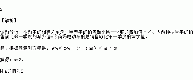2 【解析】 试题分析:本题中的相等关系是:甲型车的销售额比第一季度的增加值﹣乙、丙两种型号车的销售额比第一季度的减少值=该商场电动车的总销售额比第一季度的增加值. 【解析】 根据题意列方程得:56%×23%﹣(1﹣56%)×a%=12% 解得:a=2. 即a的值为2.