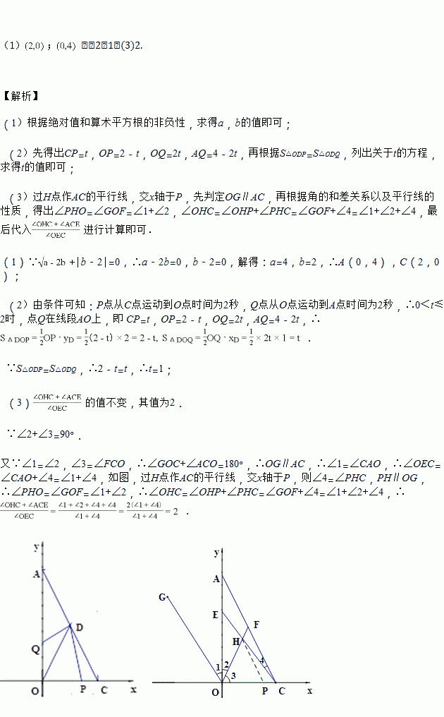 已知坐标轴上有两动点P、Q同时出发,P点从C点出发沿x轴负方向以1个单位长度每秒的速度匀速移动,Q点从O点出发以2个单位长度每秒的速度沿y轴正方向移动,点Q到达A点整个运动随之结束![]()