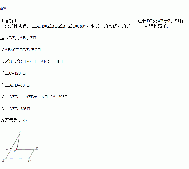 如图,AB∥CD,ED∥BC.∠A=20°,∠C=120°,则∠AED的度数是__________.