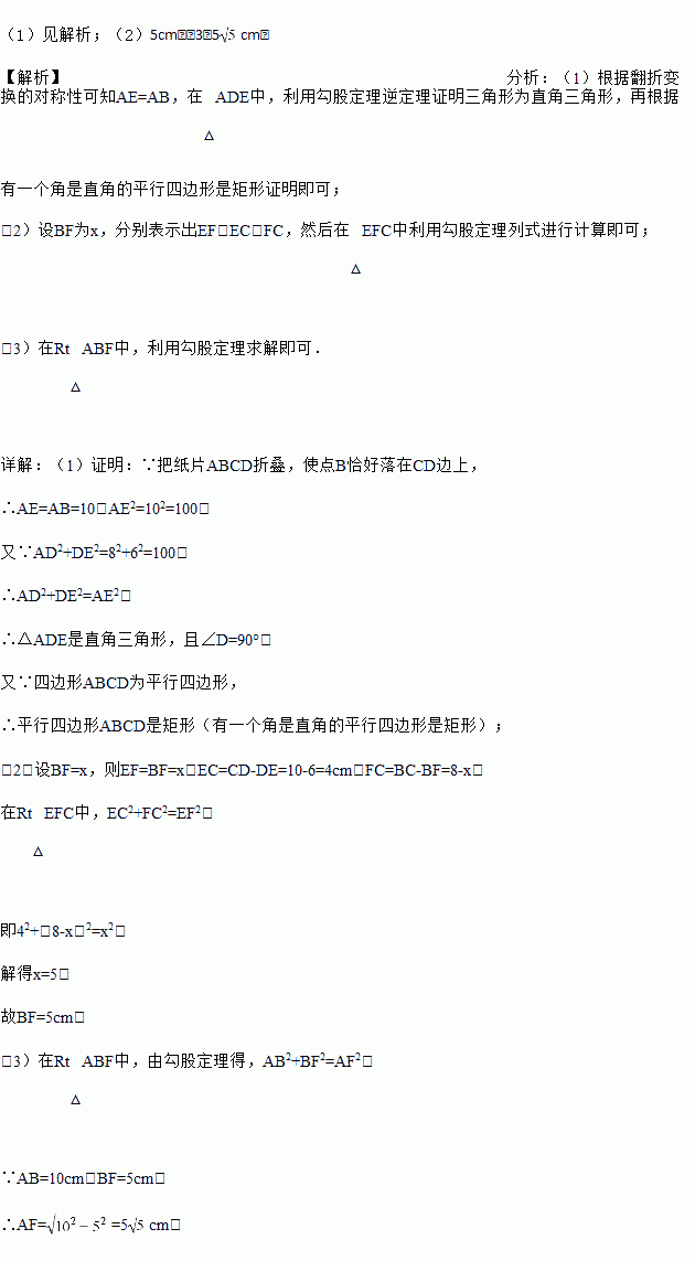 如图,四边形ABCD为平行四边形纸片.把纸片ABCD折叠,使点B恰好落在CD边上,折痕为AF.且AB=10cm、AD=8cm、DE=6cm.