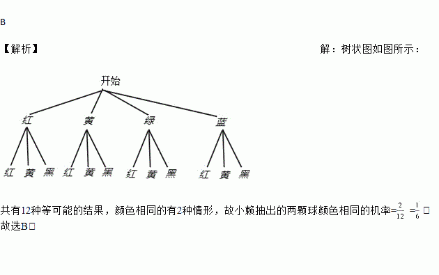 甲箱内有4颗球,颜色分别为红、黄、绿、蓝;乙箱内有3颗球,颜色分别为红、黄、黑.小赖打算同时从甲、乙两个箱子中各抽出一颗球,若同一箱中每球被抽出的机会相等,则小赖抽出的两颗球颜色相同的机率为何?( )