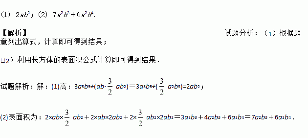 已知:长方体的体积为3a3b5cm3,它的长为abcm,宽为ab2cm.求:(1)它的高;(2)它的表面积.