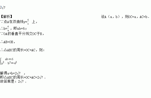 如图,点A在双曲线y=上,过点A作AC⊥x轴,垂足为C,OA的垂直平分线交OC于点B,当OA=4时,则△ABC周长为__________.