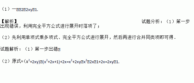 (1)一;(2)2xy﹣1. 【解析】试题分析:(1)第一步出现错误,利用完全平方公式进行展开时落项了; (2)先利用单项式乘多项式、完全平方公式进行展开,然后再进行合并同类项即可得. 试题解析:(1)第一步出错; (2)原式=(x2+2xy)﹣(x2+2x+1)+2x=x2+2xy﹣x2﹣2x﹣1+2x=2xy﹣1.