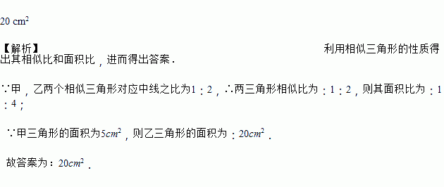 已知甲、乙两个相似三角形对应中线之比为1∶2,甲三角形的面积为5 cm2,则乙三角形的面积为__________.
