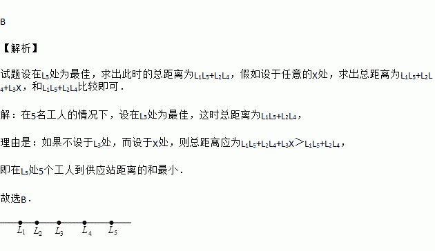 如图,一条流水生产线上L1、L2、L3、L4、L5处各有一名工人在工作,现要在流水生产线上设置一个零件供应站P,使五人到供应站P的距离总和最小,这个供应站设置的位置是( )