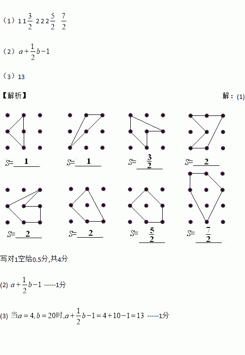 ②若用a表示多边形内部的点数,b表示多边形边界上的点数,S表示多边形的面积,你能用含a和b的代数式表示S= ____________________