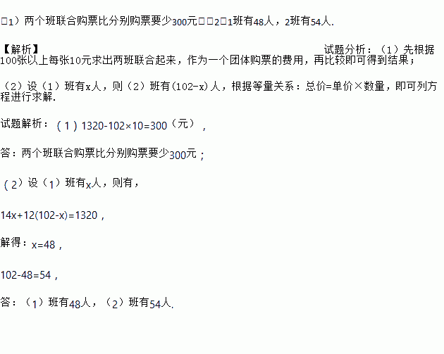 (1)两个班联合购票比分别购票要少300元;(2)1班有48人,2班有54人. 【解析】试题分析:(1)先根据100张以上每张10元求出两班联合起来,作为一个团体购票的费用,再比较即可得到结果; (2)设(1)班有x人,则(2)班有(102-x)人,根据等量关系:总价=单价×数量,即可列方程进行求解. 试题解析:(1)1320-102×10=300(元), 答:两个班联合购...