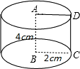 解:∵以直线AB为轴旋转一周得到的圆柱体,得出底面半径为2cm,母线长为4cm,