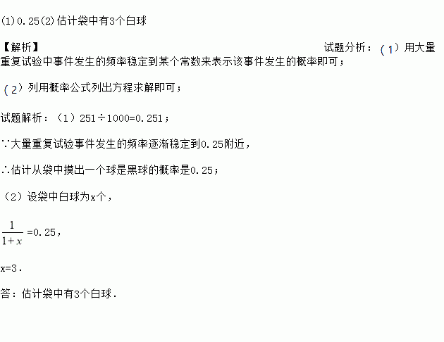 (1)0.25(2)估计袋中有3个白球 【解析】试题分析:(1)用大量重复试验中事件发生的频率稳定到某个常数来表示该事件发生的概率即可; (2)列用概率公式列出方程求解即可; 试题解析:(1)251÷1000=0.251; ∵大量重复试验事件发生的频率逐渐稳定到0.25附近, ∴估计从袋中摸出一个球是黑球的概率是0.25; (2)设袋中白球为x个, =0....