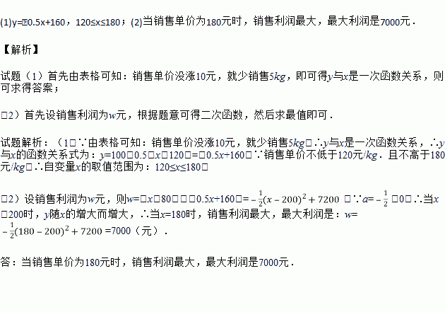 一茶叶专卖店经销某种品牌的茶叶,该茶叶的成本价是80元/kg,销售单价不低于120元/kg.且不高于180元/kg,经销一段时间后得到如下数据: