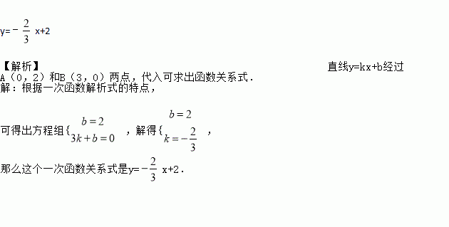y=﹣x+2 【解析】直线y=kx+b经过A(0,2)和B(3,0)两点,代入可求出函数关系式. 【解析】 根据一次函数解析式的特点, 可得出方程组,解得, 那么这个一次函数关系式是y=x+2.