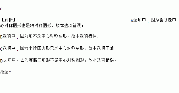 C 【解析】A选项中,因为圆既是中心对称图形也是轴对称图形,故本选项错误; B选项中,因为角不是中心对称图形,故本选项错误; C选项中,因为平行四边形只是中心对称图形,故本选项正确; D选项中,因为等腰三角形不是中心对称图形,故本选项错误; 故选C.