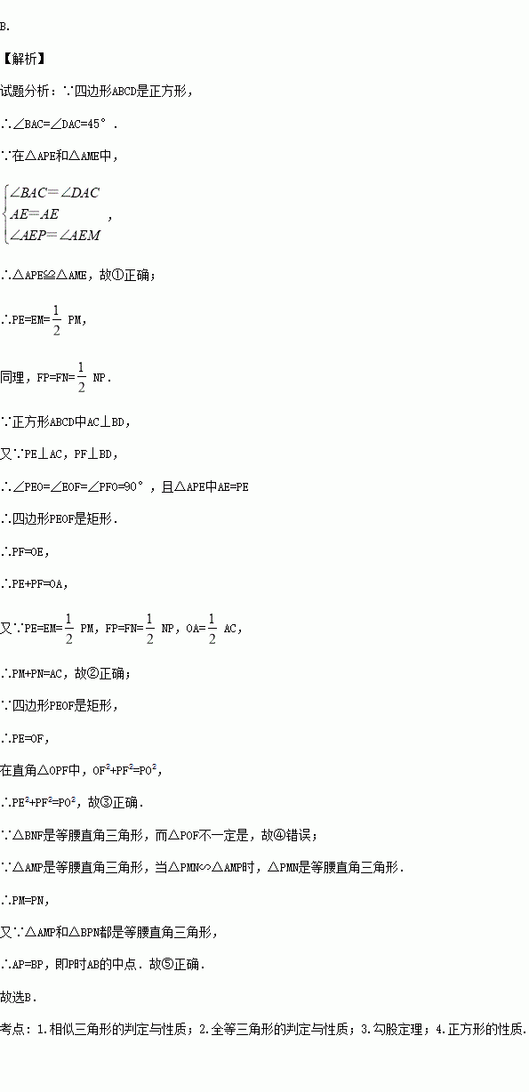 如图,在正方形ABCD中,点P是AB上一动点(不与A,B重合),对角线AC,BD相交于点O,过点P分别作AC,BD的垂线,分别交AC,BD于点E,F,交AD,BC于点M,N.下列结论:①△APE≌△AME;②PM+PN=AC;③PE2+PF2=PO2;④△POF∽△BNF;⑤当△PMN∽△AMP时,点P是AB的中点.其中正确的结论的个数有( )个.