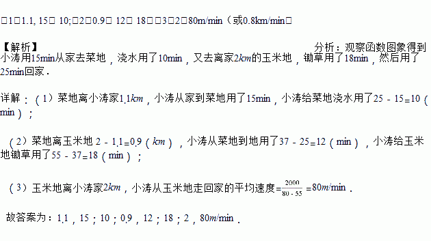 (1)菜地离小涛家的距离是____km,小涛走到菜地用了____min,小涛给菜地浇水用了___min.