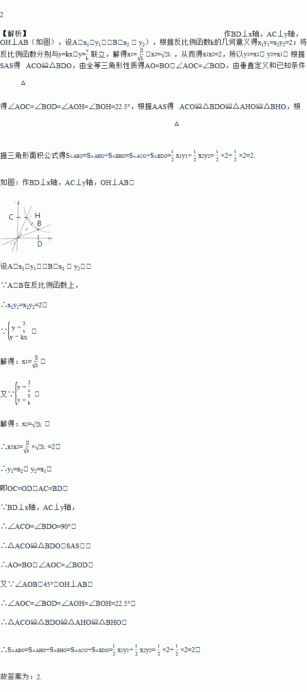 如图,在平面直角坐标系中,反比例函数(x>0)与正比例函数y=kx、 (k>1)的图象分别交于点A、B,若∠AOB=45°,则△AOB的面积是________.