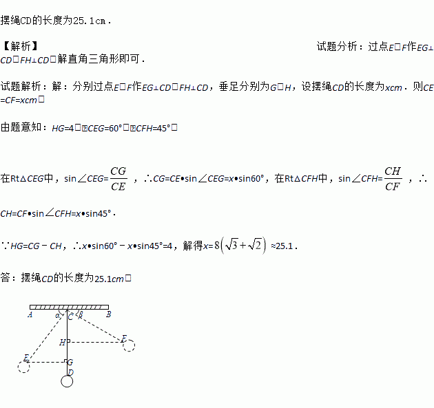 如图,物理实验室有一单摆在左右摆动,摆动过程中选取了两个瞬时状态,从C处测得E、F两点的俯角分别为∠ACE=60°,∠BCF=45°,这时点F相对于点E升高了4cm.求该摆绳CD的长度.(精确到0.1cm,参考数据: