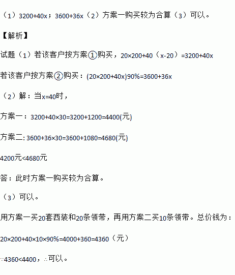 某服装厂生产一种西装和领带,西装每套定价200元,领带每条定价40元.厂方在开展促销活动期间,向客户提供两种优惠方案:①买一套西装送一条领带;②西装和领带都按定价的90%付款.现某客户要到该服装厂购买西装20套,领带x条(x>20):