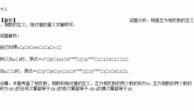 x与y互为相反数,m与n互为倒数,|a|=1,求代数式a2-(x+y+mn)·a+(x+y)2 016+(-mn)2 015的值.