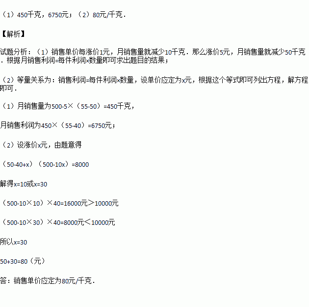 (1)当销售单价定为每千克55元,计算月销售量和月销售利润;