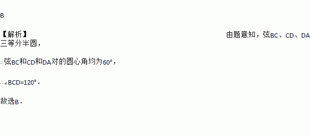 如图,AB是⊙O的直径,BC、CD、DA是⊙O的弦,且BC=CD=DA,则∠BCD=( )