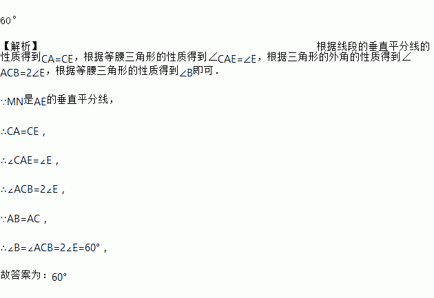 如图,在△ABE中,∠E=30°,AE的垂直平分线MN交BE于点C,且AB=AC,则∠B=________.