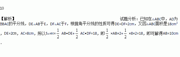 如图,在△ABC中,AD为∠BAC的平分线,DE⊥AB于E,DF⊥AC于F,△ABC面积是18, AC=8cm, DE=2㎝,则 AB的长是_______