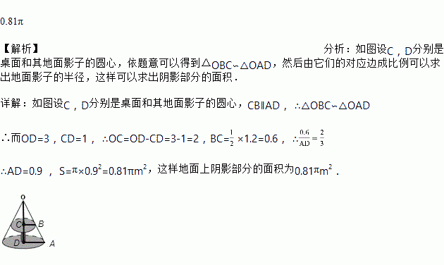 如图是圆桌正上方的灯泡O发出的光线照射桌面后,在地面上形成阴影(圆形)的示意图.已知桌面的直径为1.2m,桌面距离地面1m,若灯泡O距离地面3m,则地面上阴影部分的面积为_____m2.