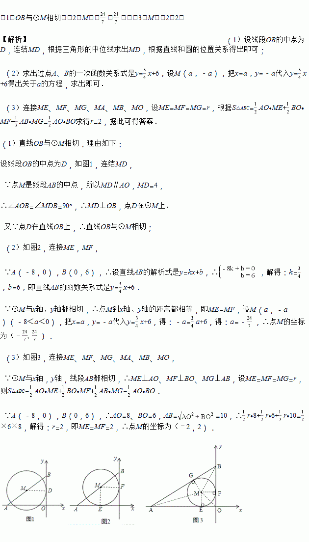 (3)如图3,⊙M与x轴,y轴,线段AB都相切,切点分别为E,F,G,试求出点M的坐标(直接写出答案)