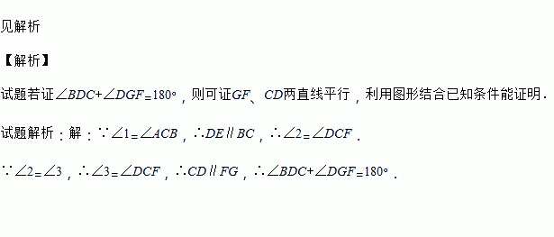 如图,∠1=∠ACB,∠2=∠3,求证:∠BDC+∠DGF=180°.