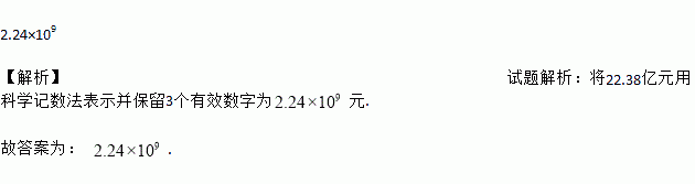 2.24×109 【解析】试题解析:将22.38亿元用科学记数法表示并保留3个有效数字为元. 故答案为: .