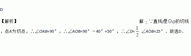 如图,直线l是⊙O的切线,点A为切点,B为直线l上一点,连接OB交⊙O于点C,D是优弧AC上一点,连接AD、CD.若∠ABO=40°.则∠D的大小是( )