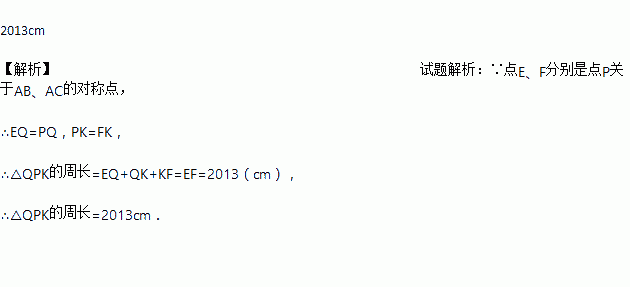 如图,点P为∠BAC内的一点,点E、F分别是点P关于AB、AC的对称点,若EF=2013cm.则△QPK的周长是__________.