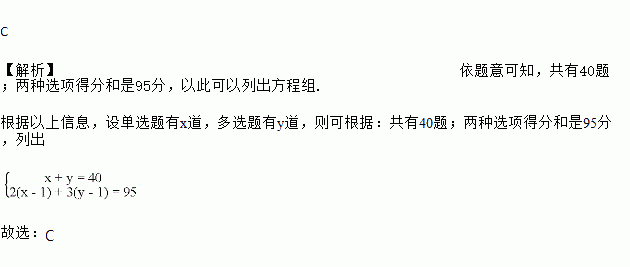 根据以上信息,设单选题有x道,多选题有y道,则可列方程组为( )