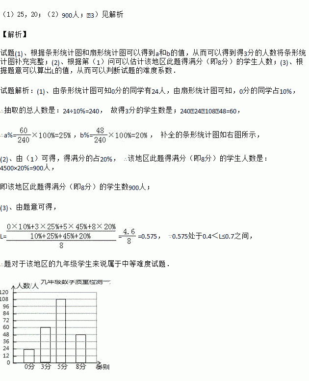 ijµØÇøÔÚÒ»´Î¾ÅÄê¼¶Êýѧ×öÁ˼ì²âÖУ¬ÓÐÒ»µÀÂú·Ö8·ÖµÄ½â´ðÌ⣬°´ÆÀ·Ö±ê×¼£¬ËùÓп¼ÉúµÄµÃ·ÖÖ»ÓÐËÄÖÖ£º0·Ö£¬3·Ö£¬5·Ö£¬8·Ö£®ÀÏʦΪÁËÁ˽âѧÉúµÄµÃ·ÖÇé¿öÓëÌâÄ¿µÄÄÑÒ×Çé¿ö£¬´ÓÈ«Çø4500Ãû¿¼ÉúµÄÊÔ¾íÖÐËæ»ú³éȡһ²¿·Ö£¬Í¨¹ý·ÖÎöÓëÕûÀí£¬»æÖÆÁËÈçÏÂÁ½·ùͼ²»ÍêÕûµÄͳ¼ÆÍ¼£®