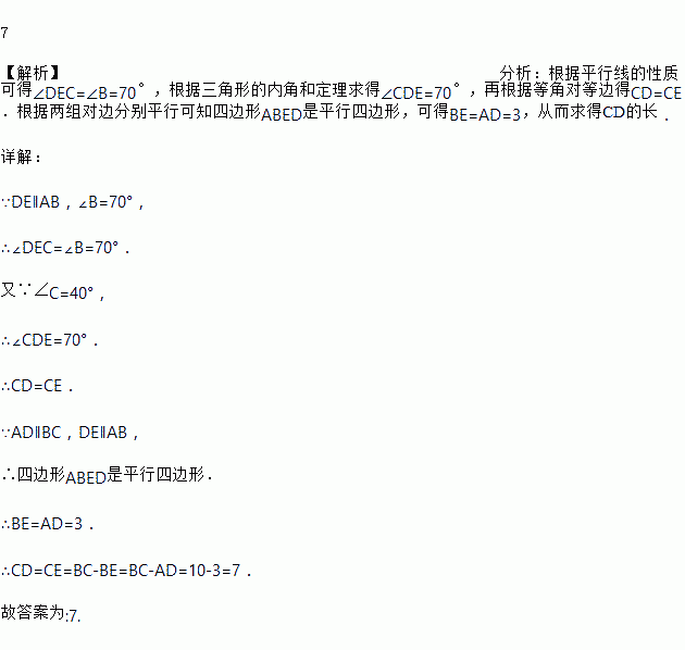 如图所示,在梯形ABCD中,AD∥BC,∠B=70°,∠C=40°,过点D作DE∥AB交BC于点E,若AD=3,BC=10,则CD的长是________。