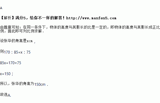在一个晴朗的下午,张华和小王一起去放风筝,在路上,小王注意到地上自己的影子比张华的影子长,而且自己的身高是170 cm,经测量张华的影长是75 cm,小王的影长是85 cm,则张华的身高是( )